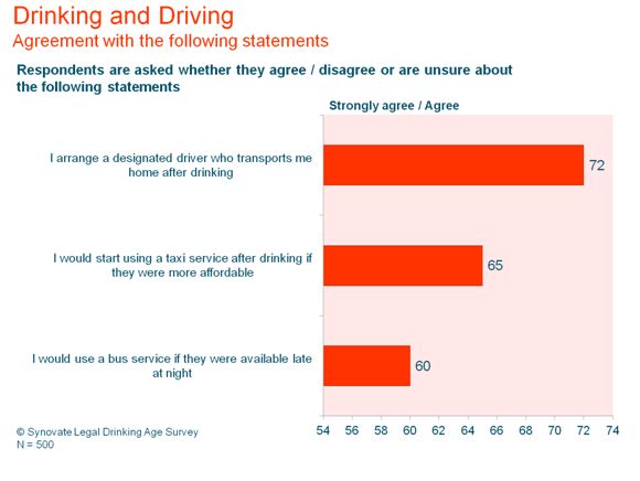 Of the 500 respondents interviewed, 56% had heard about the proposal with 44% unaware that the legal drinking age was being reconsidered. Two-thirds believe that the proposal will decrease both alcohol abuse and underage drinking. The majority of respondents also believe that drunken driving and violent behaviour / domestic abuse could also be reduced if the law is passed (64% and 62% respectively).