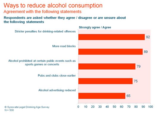 Consequences such as stricter penalties for drinking-related offences and increased roadblocks were popular with 92% and 89% of respondents respectively. Banning of alcohol advertising was favoured by 65% of those polled.