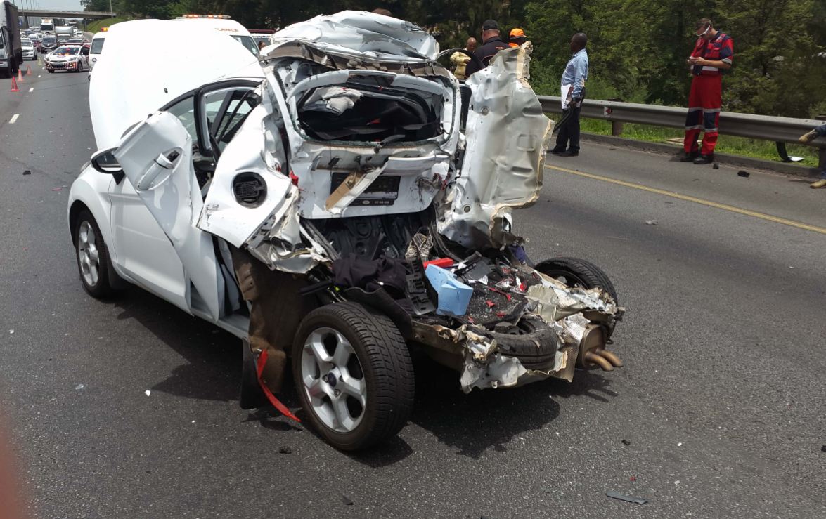 A man in his twenties miraculously escaped without serious injury when a truck collided into the back of his Ford earlier this morning on the N1 north before William Nicol, Fourways.
