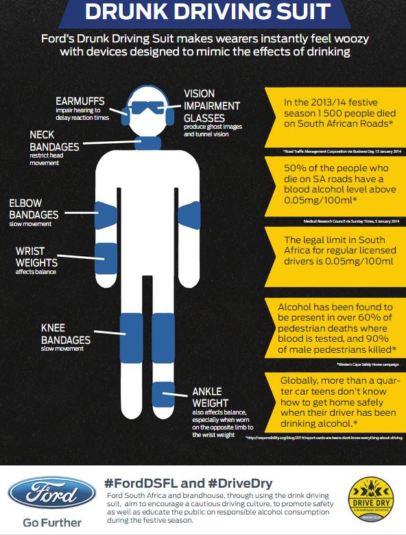 “Ford’s innovative drunk driving suit makes users instantly feel unsteady with devices designed to mimic the effects of drinking,” said Eugene Herbert, Ford’s Driving Skills For Life programme manager in South Africa. “Showing the effects of drinking and driving, or drinking and walking, is especially pertinent at this time of the year, as we head into another festive season. Research indicates that around 50% of people who die on our roads have a blood alcohol concentration above 0.05 gram per 100 millilitres. “The drunk driving suit helps demonstrate in a very easy way the clear correlation between peoples’ consumption of alcohol and their impaired actions.”