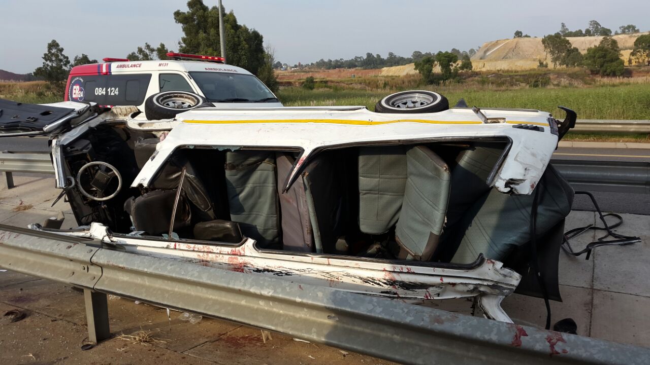 ER24 paramedics, along with other services, arrived on scene and found a large bus parked in the emergency lane of the highway. A wrecked taxi lay between the centre mediums splitting the highways.