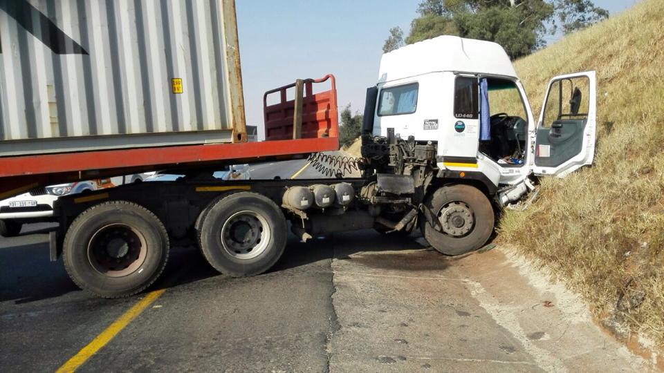 Motor vehicle crash on the M2 direction West near the Cleveland off-ramp, the truck and Jeep were both traveling East, when the truck driver lost control and pushed the Jeep and itself over the barrier into on-coming traffic and hitting the embankment.