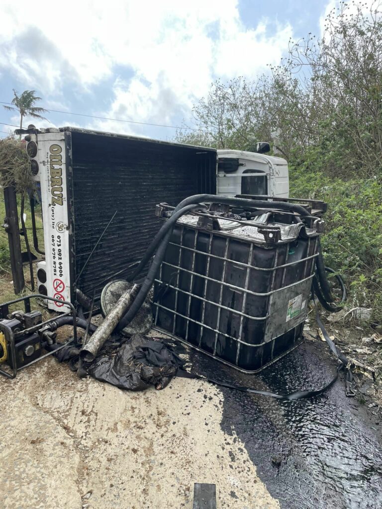 The bakkie loaded with two flow bins filled with approximately 1300 litres of used oil stalled while ascending a steep driveway. The driver was unable to stop the vehicle after it started to roll back downhill. The passenger jumped out before it overturned.
