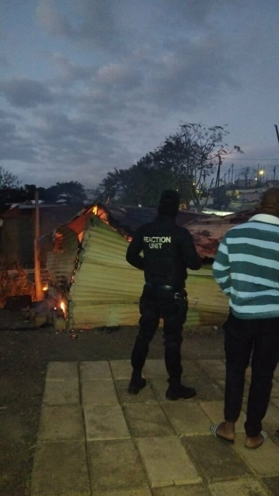 Upon arrival, Reaction Officers discovered a wood and iron structure in flames. Residents informed Officers that the home belonged to an individual who fled the area following an altercation in which he allegedly hacked another person. Community members have since been actively searching for the suspect, purportedly intending to exact mob justice.
