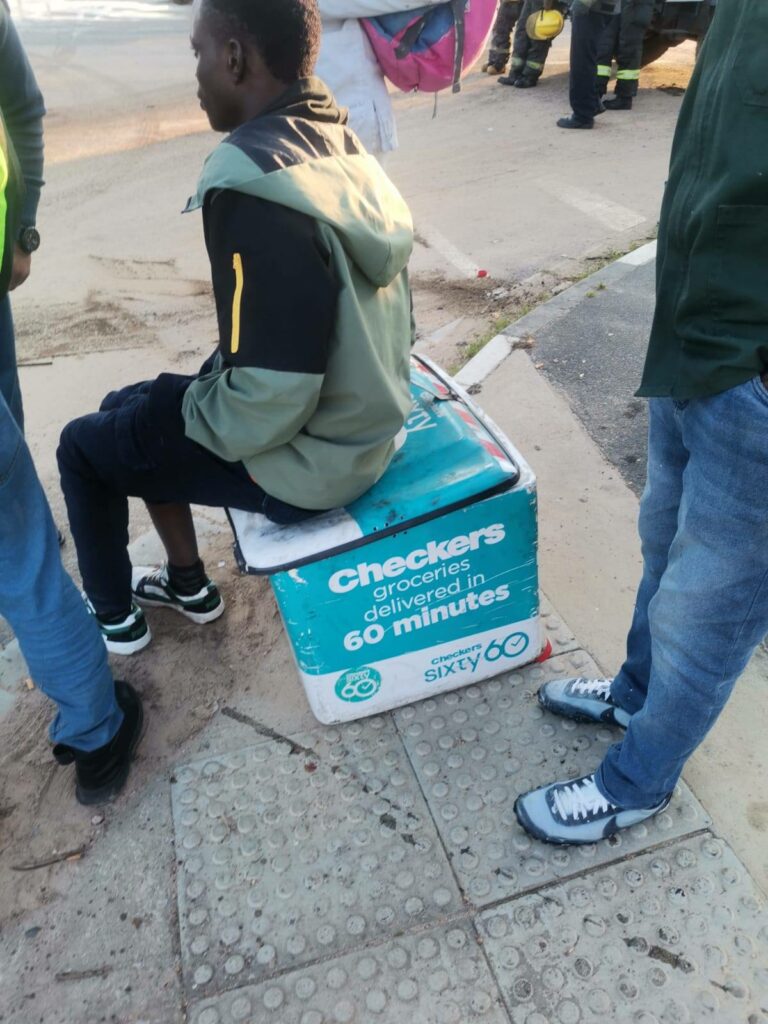 DFW volunteer and EFAR responder Garine de Wet reported to the DFW control and emergency group regarding an accident between a motorbike and a vehicle, in which the motorbike caught alight and the driver was injured.